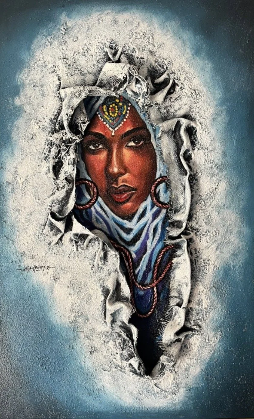 Ola Henry is a Nigerian mixed media artist whose work explores identity, and culture through rich textured, fabric based compositions rooted in tradition.